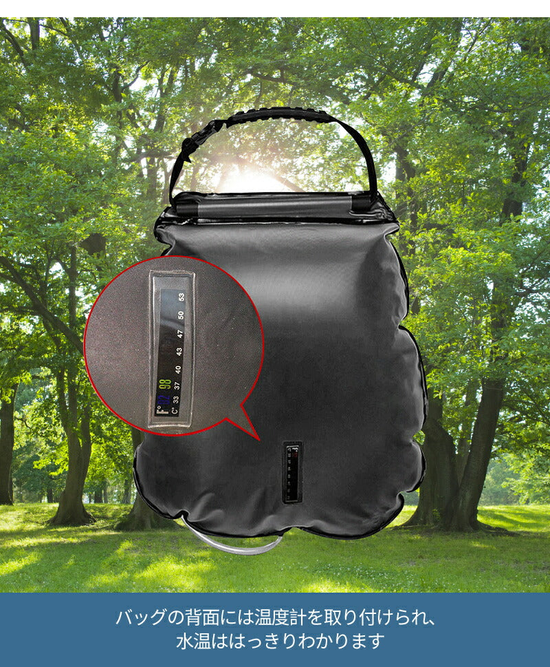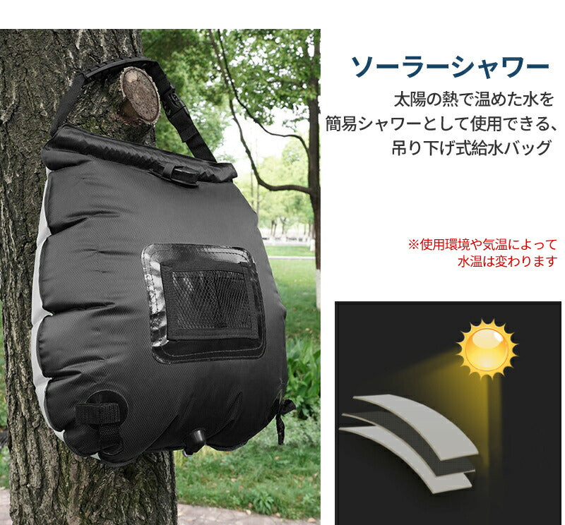 アウトドアシャワー 20L ポータブルシャワー 簡易シャワー 電源不要 ロープ フック付き 太陽光 温水シャワー ブラック シャワータンク 給水袋 折りたたみ showerbag-02
