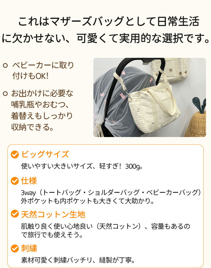 【10%OFF★5/1日~8日 23:59迄】マザーズバッグ ヌビバッグ 斜め掛け イブル 3way 軽量 大容量 トート ベビーカーバッグ ポケット付き キルitem-241231
